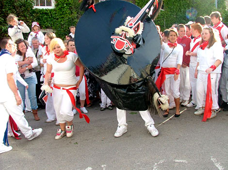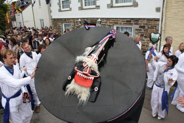 To this day one can still sense the sheer vivacity of such proceedings, and the genuine spirit of celebration at the rebirth of the spring god of fertility. The ‘Oss’, it has to be said, looks far more like a dragon than a horse, and of course St George, as the spirit of renewal, is a central figure in this and many other such celebrations. At Padstow he ritually ‘dies’ accompanied by an emotionally-charged and mournful song before suddenly the Oss suddenly leaps up, reborn at the same moment as St George.