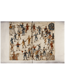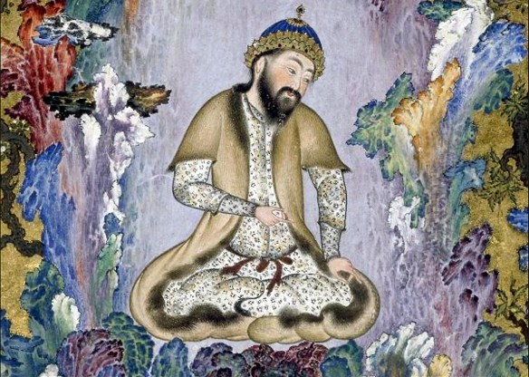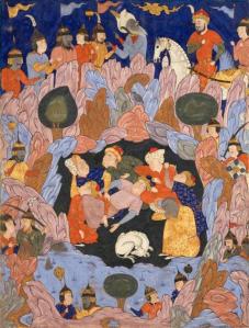 At the center, King Gayumars (first king of Persia according to the legend) is seated cross-legged and levitating above his many courtiers. On his sides, his son, Siyamak, is standing on the right, while his grandson, Hushang, is seated on the left. The harmony between the lavish vegetation, which goes beyond the margin, and the people is to be noted. In addition, the stylistic similarities with Chinese art in this Persian work show how cultural exchange happened even within the arts during the time.