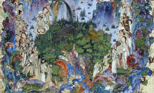 The court of Kyumars, first mythical king of Iran, reigning on an Edenic land in an eternal spring. Illustration of the Book of Ferdowsi Kings. Shâhnâmeh of Shah Tahmasp (Shahnameh of Shah Tahmasp: A Book of Illustrated Kings of the 16th Century), Tabriz, c. 1537.
