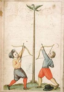 Popinjay or Papingo (signifying a painted bird), also called pole archery, is a shooting sport that can be performed with either rifles or archery equipment. The object of popinjay is to knock artificial birds off their perches. The rifle form is a popular diversion in Denmark; a Scottish variant is also known. The archery form, called staande wip[1] in Flemish language, is popular in Belgium and is shot occasionally in the United Kingdom under the governance of the Grand National Archery Society. In Germany a traditional shooting at wooden birds placed on a high pole is called “Vogelschießen” (that is “bird shooting”). These are carried out either with small bore rifles or crossbows.