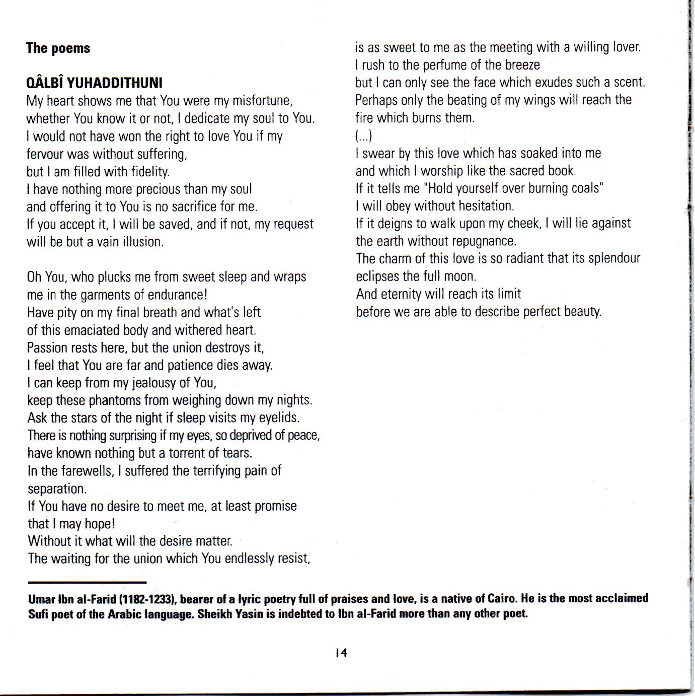 With similar stories Ali offered proof of Ibn al-Farid’s scrupulous dealings with the ruling elite, particularly the Ayyubid sultan Muhammad al-Malik al-Kamil. This sultan patronized the arts and sciences, and his study sessions with scholars were well known. CAH said that, during one such session, al-Malik al-Kamil and a number of litterateurs were reciting and discussing verses ending with the vowelless “ya°,” a most difficult rhyme. No one could recite more than ten lines using the rhyme except the sultan, who had memorized fifty verses. After he recited them, however, his secretary, Sharaf al-Dln, recalled that he knew an ode of one hundred and fifty lines rhyming in “ya” The sultan was amazed and commanded his secretary to recite the poem, which began: